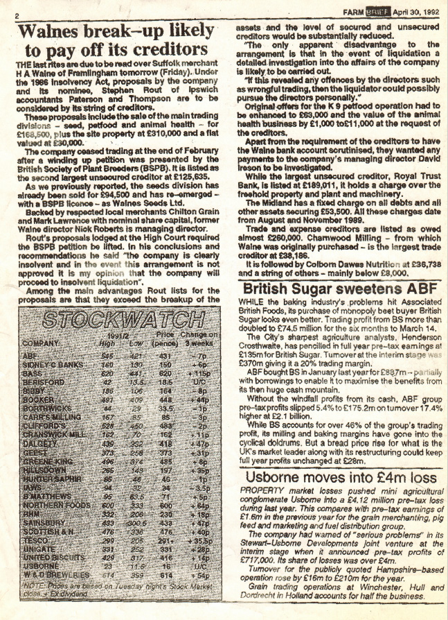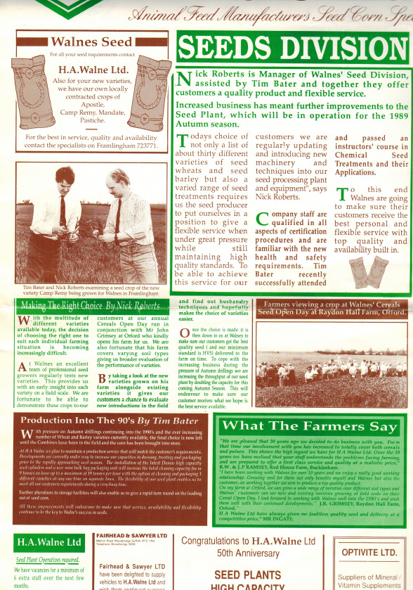 Consolidation during the mid-1980s Walnes brought some restructuring with investment focused on modernising its milling and seed processing facilities – a strategy that cemented Walnes reputation as a high-quality seed processor and supplier. The seed division continued to expand and when HA Walnes merchanting ceased trading in 1992, Walnes Seeds Ltd emerged as independent, specialist seed supplier.